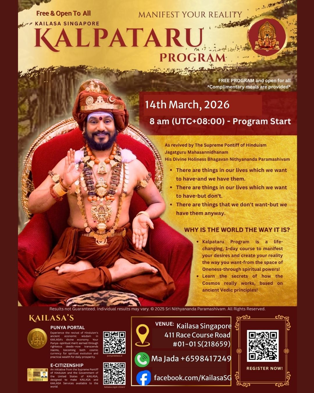 Visit facebook.com/KailasaSG for the latest weekly schedule of activities including weekly puja(s).